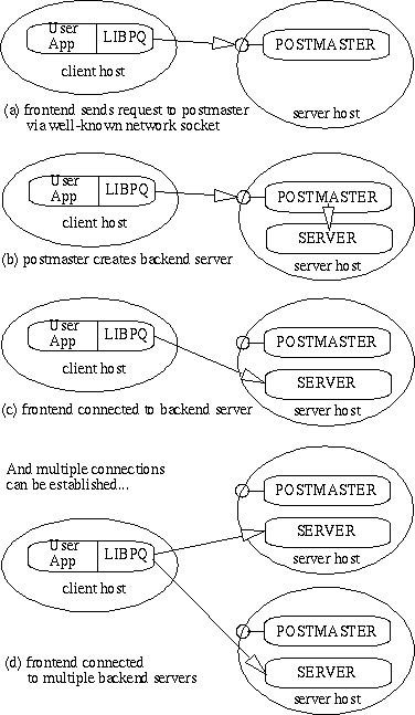 and connects the frontend process to the new server (How a connection is established(c)). From that point on, the frontend process and the backend server communicate without intervention by the postmaster. Hence, the postmaster is always running, waiting for requests, whereas frontend and backend processes come and go. The libpq library allows a single frontend to make multiple connections to backend processes. However, the frontend application is still a single-threaded process. Multithreaded frontend/backend connections are not currently supported in libpq. One implication of this architecture is that the postmaster and the backend always run on the same machine (the database server), while the frontend application may run anywhere. You should keep this in mind, because the files that can be accessed on a client machine may not be accessible (or may only be accessed using a different filename) on the database server machine. You should also be aware that the postmaster and postgres servers run with the user-id of the Postgres "superuser." Note that the Postgres superuser does not have to be a special user (e.g., a user named "postgres"), although many systems are installed that way. Furthermore, the Postgres superuser should definitely not be the Unix superuser, "root"! In any case, all files relating to a database should belong to this Postgres superuser.